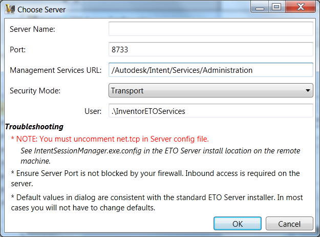 - Security Mode (required) Specifies the server security mode, which defaults to transport security enabled on the server. You can disable security using IntentSessionManager.exe.config on the server (see instructions in the config file). We recommend that you do not disable security, but at times, it is useful for debugging connection problems. If you disable security, select None for the Security Mode.