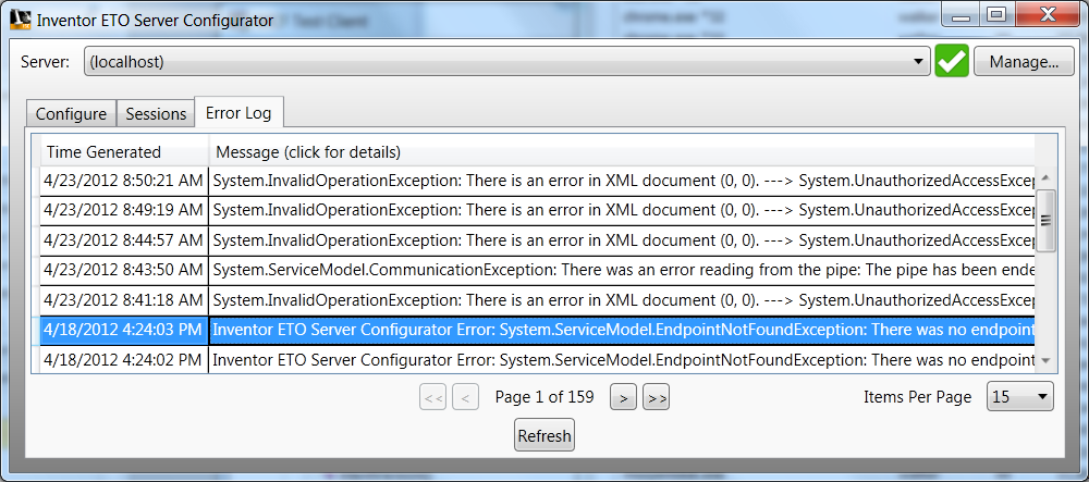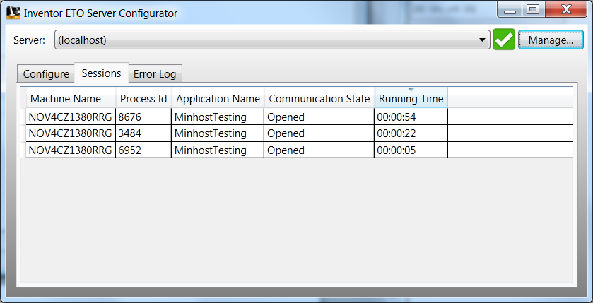 When the ETO Server Configurator initializes, the default Server is localhost. See New Server Connection following for information about connecting to another server. To display the Manage Server dialog box, click Manage…, unless you are connected to a remote server (described below). The Manage Server dialog box displays information about the server connection