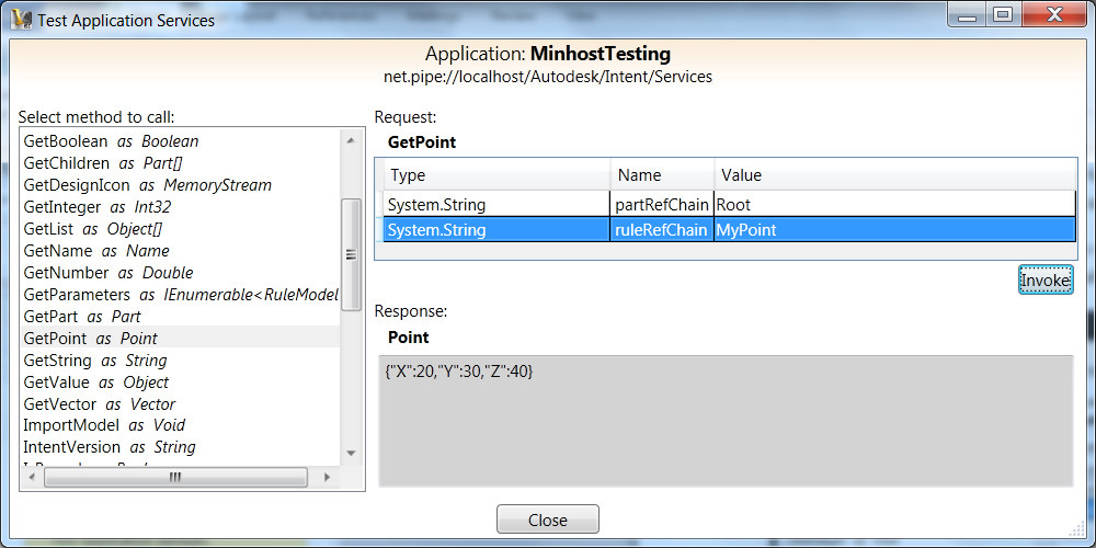 - Select from the list of available methods to call for testing. Items are listed by the method name and return type. Some methods defined in IIntentServices are not available, specifically methods that take generic .Net Objects as parameters.