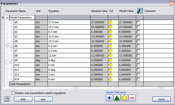 - Review the list of model parameters already assigned to the part.