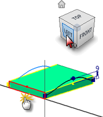Start the Spline command and sketch a spline from the midpoint of the projected vertical line to a point above the midpoint of the part. Place the final point at the midpoint of the opposite projected vertical line. Double-click the last point to create the spline.