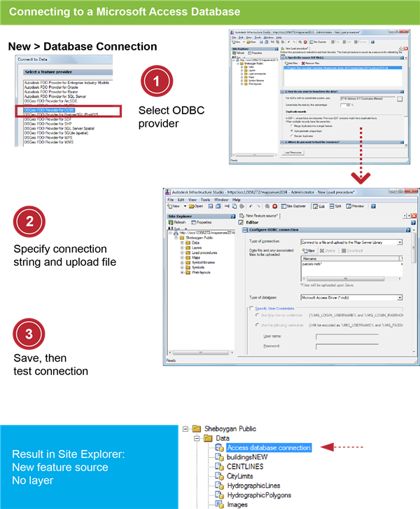 In this exercise, you make a connection to the Microsoft Access database for the Sheboygan parcels data and save the connection as a resource.