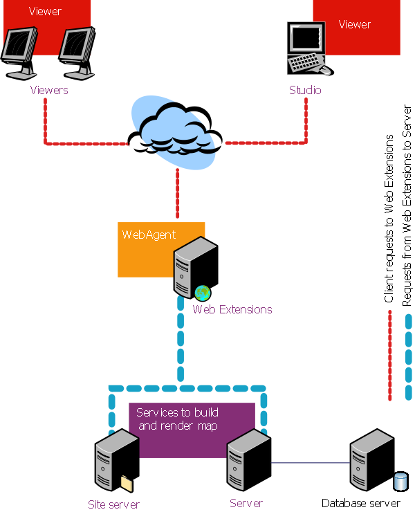 Infrastructure Studio and the Infrastructure Map Server viewers are client applications of Infrastructure Map Server. Requests coming from these clients, and from the other client applications that you develop using the API, go to the Web Server Extension by means of HTTP protocol. The WebAgent component of the Web Server Extension processes the requests and forwards them on to Infrastructure Map Server. When you start Infrastructure Studio, you enter the name or the IP address of the web server that is hosting the Web Server Extension. For example, http://144.111.19.94/mapserver2012