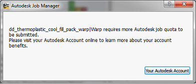 Each analysis type, for example, Fill, or Warp, or Cool, or Fill+Pack, is considered to be a single Job. Thus an analysis sequence such as Fill+Cool, is valued at two (2) Jobs. Likewise, Cool,+Fill+Pack,+Warp is valued at three (3) "Jobs", since Fill+Pack is a single Job. You can top up your Autodesk Account to ensure that you have sufficient Jobs to complete your analysis sequence.
