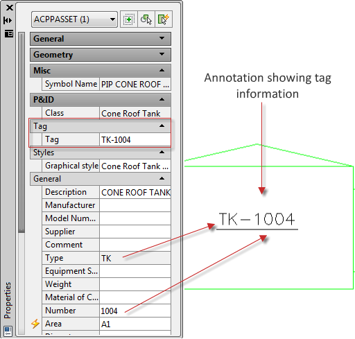 | Not text, but data. Comprised of sub parts as defined by the tag format. | Text defined in the annotation style block definition. This text can include the tag property of a component or line segment. This text is not a tag, but an annotation. |