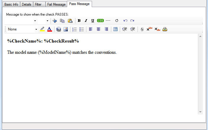 The Pass Message tab in Model Review controls the message displayed in the Results Browser once a check has been run that matches the given criteria.