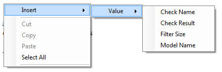 At the top is a standard WYSIWYG HTML editor. Below in the body is where you would enter text, images, hyperlinks, tables and details to help aid the users in identifying why the given check may have failed. Areas with the % symbol are "dynamic text". When used they will be replaced with the actual check values in the Results Browser. The dynamic text can be added by right clicking in the body and selecting from the Insert flyout: