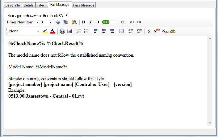 The Fail Message tab in Model Review controls the message displayed in the Results Browser once a check has been run that fails the given criteria.