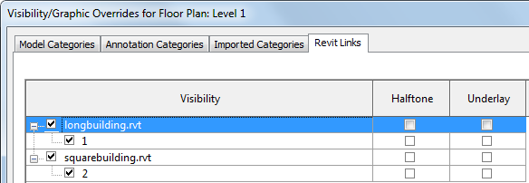Parameters that control the visibility and graphics of linked Revit models are grouped under their own tab, Revit Links, in the Visibility/Graphics dialog.