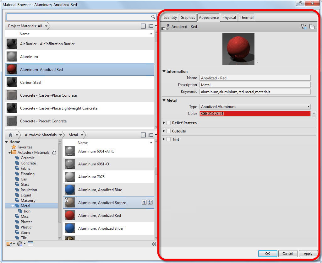 In the Material Browser, this information displays on the Identity, Graphics, and Appearance tabs of the Material Editor panel.