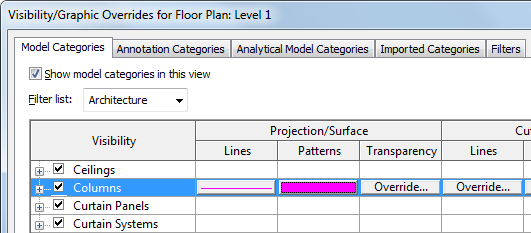 In the following image, the Columns category has overrides for projection/surface lines and patterns.