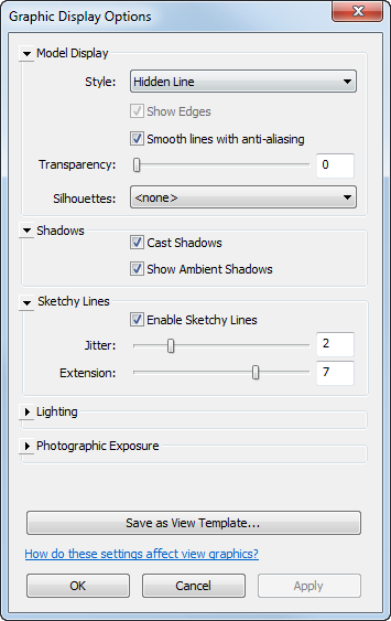 See the results when sketchy lines are applied to a perspective view, an elevation view, and a plan view.