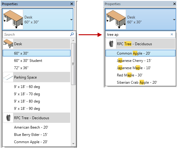 A search feature is available in Revit LT to make it easier to select from a long list of options. You can search in the following functional areas: