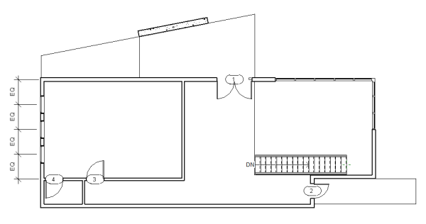 - Click at the corner of the external walls to the right of the double doors, move the cursor up, and click at the intersection of the walls, move the cursor to the left, and click to create a railing on the entry porch, as shown: