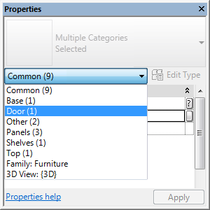 Immediately below the Type Selector is a filter that identifies the category of the elements a tool will place, or the category and number of elements selected in the drawing area. If multiple categories or types are selected, only the instance properties common to all display on the palette. When multiple categories are selected, use the filter’s drop-down to view only the properties for a specific category or for the view itself. Selecting a specific category does not affect the overall selection set.