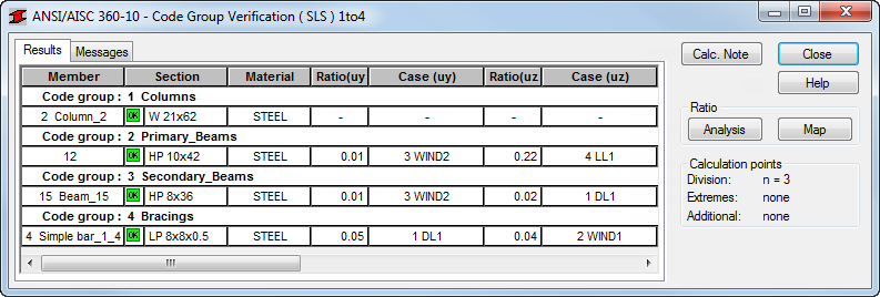 The Code Group Verification dialog opens displaying the most significant information about the sections. The Messages tab (as shown below), contains important information for the next steps in the design process:
