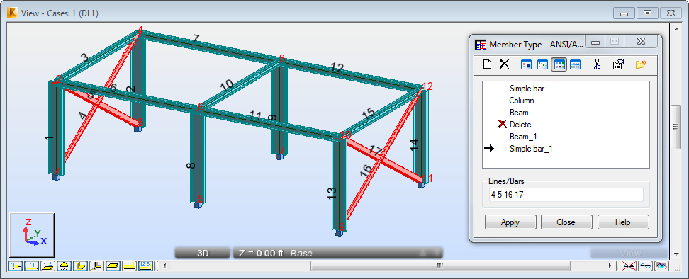 Alternatively, place the cursor in the Lines/Bars field, then go to the drawing area, and hold the Ctrl key to select bracings with numbers 4, 5, 16 and 17.