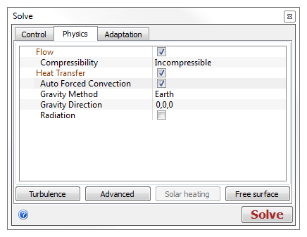 3. On the Physics tab, enable Heat Transfer and Auto Forced Convection. Click Solve.