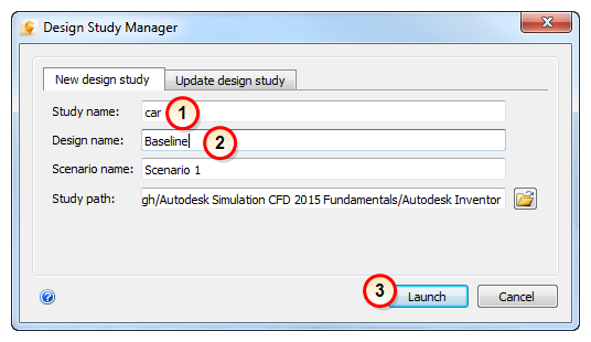 3. In the Design Study Manager, assign names to the design study, design, and scenario