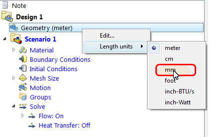 1. Ensure units are set to mm on the Geometry branch of the Design Study Bar.