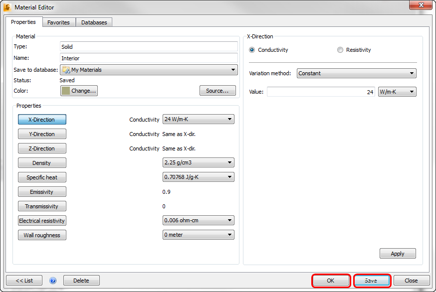 16. To save the new material to your custom material database, click Save and OK in the Material Editor.