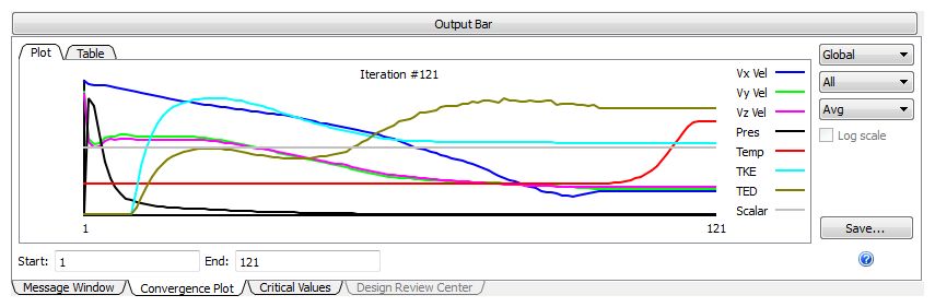 Autodesk Simulation CFD constantly examines small and large frequency changes throughout the solution field, and evaluates the local and global fluctuations of each degree of freedom. Automatic Convergence Detection determines when a solution is converged, and automatically stops the analysis. (Converged = when the solution stops changing.) This is indicated by the conclusion of the analysis prior to reaching the number of iterations prescribed by the user. It is also accompanied with a message in the Output Bar that flat lines have been detected.