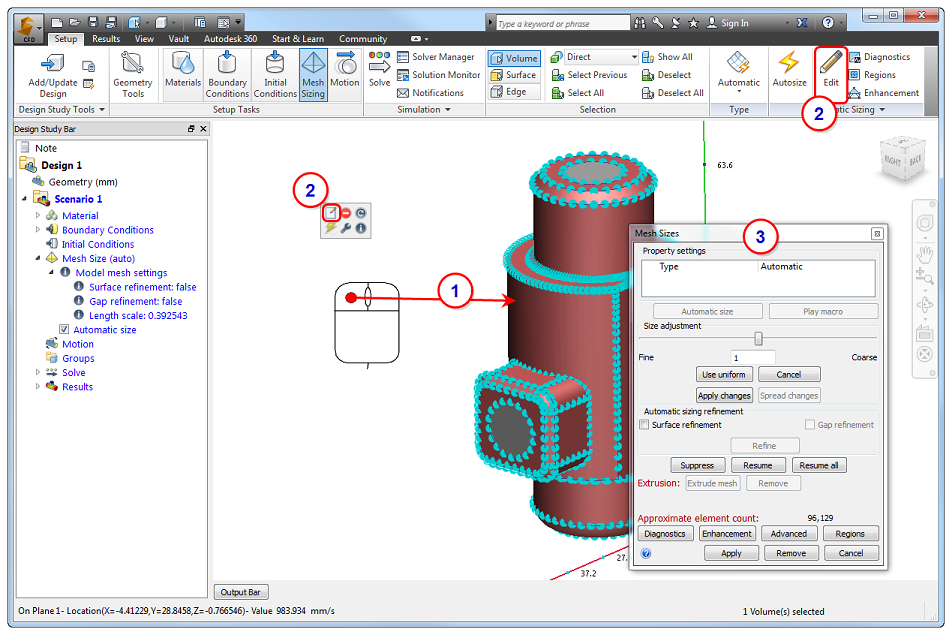 Use the Mesh Tools to customize the mesh distribution. All tools are accessible from the Mesh Sizes quick edit dialog. To simplify the workflow, many are also available on the context tool bar and on the context panel.