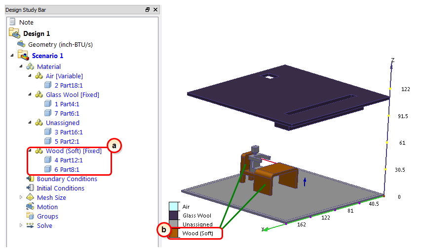 a. On the Design Study bar, confirm the material assignment for the Wood (Soft) parts..