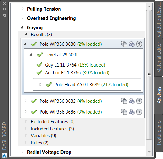 If Auto Resolve is selected in the Analysis panel, the Sag and Guy analysis operations are performed automatically as you create pole and line features. Auto Validate and Auto Resolve generate one guy per level except for buck pole heads have two guys.