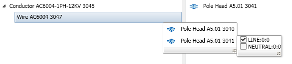 - If assigning wires to pole head ports, expand the conductor to display the wire. Click the Connected To icon to display the pole heads to which the wire is attached. Hover over each pole head to display the available pole head ports. Specify the appropriate pole head port for the wire.