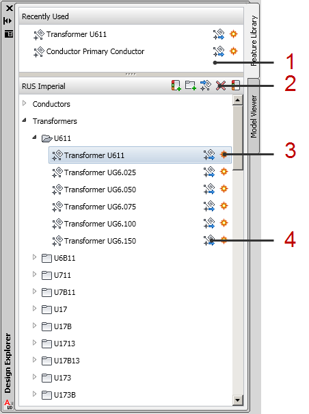 The Feature Library tab on the Design Explorer categories organize features into large groups. Folders organize features into smaller groups. You can select features in the design and add them to any selected folder. You can also create categories and folders that organize features as needed for your work.