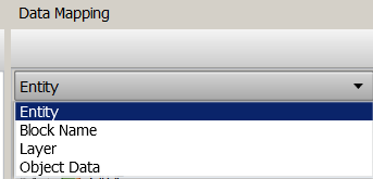 If the source is DWG, you can create mappings from entities, blocks, layers, or object data, to corresponding feature classes in the industry model. From the drop-down list, select Entity, Block Name, Layer, or Object Data.