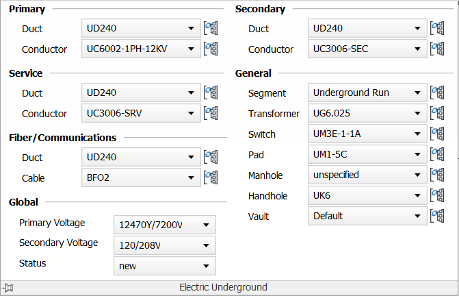 • For Electric Underground, specify default models to use for primary, secondary, and service ducts and conductors, and for segments, transformers, switches, pads, manholes, handholes, and vaults.