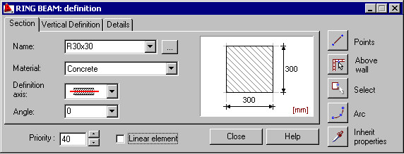 Use the icons on the right to select a mode of graphic definition for the ring beam.