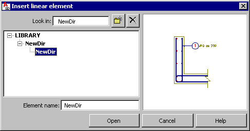 After selecting a linear element saved earlier on disk (applying the Create linear element option), a block of drawing elements is placed in a drawing. A selected linear element is given a name and length (see the Linear element parameters dialog ); elements' spacing over the length is also determined (e.g. elements spaced at 200 mm over the 2000 mm-length).