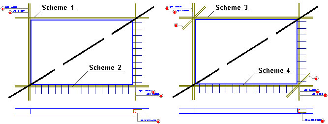 The example of reinforcement of a rectangular opening in a slab, with the use of all the four reinforcement schemes, is shown below.
