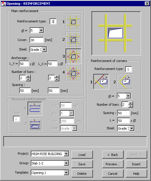 main reinforcement, structural reinforcement and reinforcement of corners. The Main reinforcement field holds options enabling parameters of the main reinforcement of an RC slab's opening.