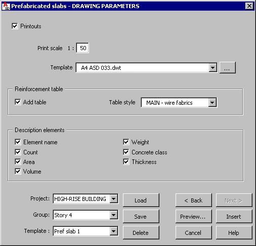 The lower part of the dialog includes the description of elements placed in drawings of individual slabs. The following descriptions can be added: element name, element number (count), area of prefabricated slab distribution, concrete volume, concrete weight, concrete class and thickness of prefabricated slabs.