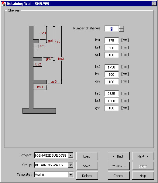The top part of the dialog provides fields for selecting a number of shelves of a retaining wall (the number of shelves may not be greater than 3). Once the number of shelves is determined, the lower part of the dialog displays a list of dimensions for the relevant number of retaining wall shelves.