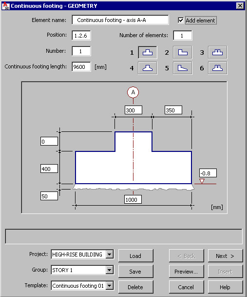 This option is used to define the geometry for a typical structure used for defining geometry and reinforcement of a continuous footing. Select the option from: