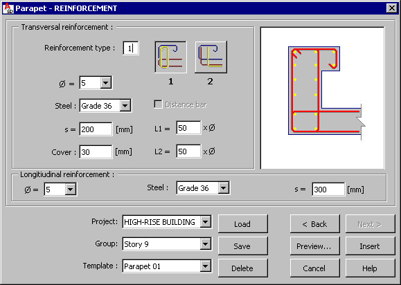 The Template list includes user-defined templates (schemes) of parapets and their reinforcement. After defining the parapet geometry and reinforcement, it is possible to save these settings by specifying a name in the Template field and clicking the Save button (Note: a template is saved in a selected group and a selected project). After defining the parapet reinforcement and selecting the name of a saved template (in a selected project and a selected group), all parameters in the dialog are set exactly as they are defined in the template.