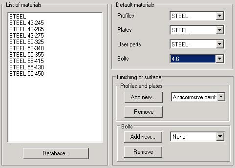 - Under Default materials, you can select a material from lists of profiles, plates, user parts, and bolts. The selected materials will be adopted by default in the dialogs for definition of profiles, plates, user parts,or bolts.