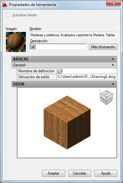 La herramienta de material aparece en la paleta representada mediante el icono de cubo de AutoCAD Architecture con la visualización correcta del material.