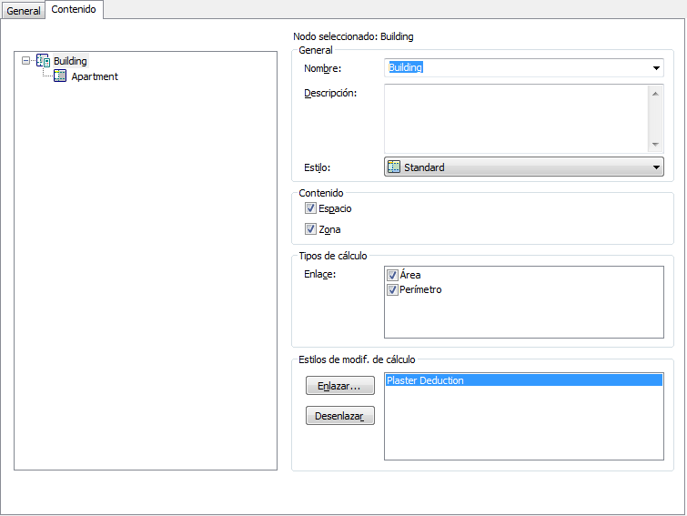Por ejemplo, podría hacer que un nodo de zona Moqueta calculase la cantidad necesaria de moqueta y que un nodo de zona Zócalo calculase la cantidad necesaria de zócalo. Para el nodo de zona Moqueta, en Calcular área, seleccione Sí. Para el nodo de zona Zócalo, en Calcular perímetro, seleccione Sí.