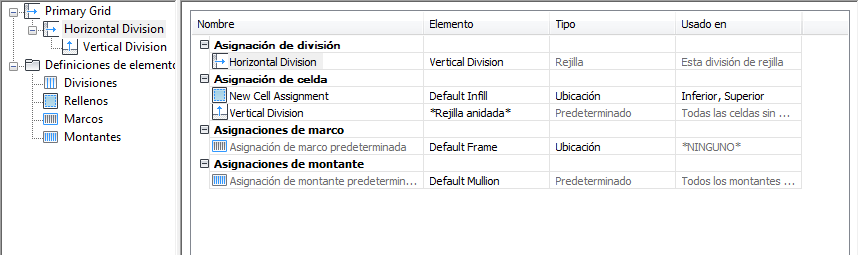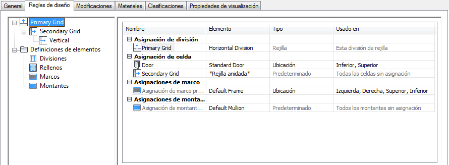 Puede definir rejillas anidadas en la ficha Reglas de diseño del cuadro de diálogo Propiedades de conjunto de puerta y ventana. El árbol de la izquierda de la ficha muestra las rejillas. Siempre existe una sola rejilla principal, que puede tener una o varias rejillas secundarias. Cada rejilla secundaria puede tener una o varias rejillas terciarias, y así sucesivamente.