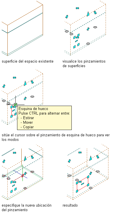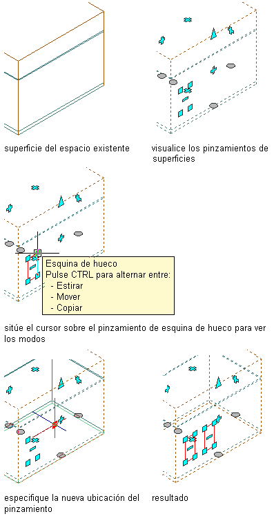 Siga este procedimiento para estirar, mover o copiar un hueco de superficie en un espacio tridimensional extruido.