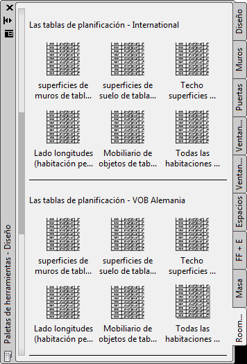 La paleta de herramientas Roombook contiene las distintas tablas de planificación según la norma de cálculo actual. Los comandos están vinculados al archivo
