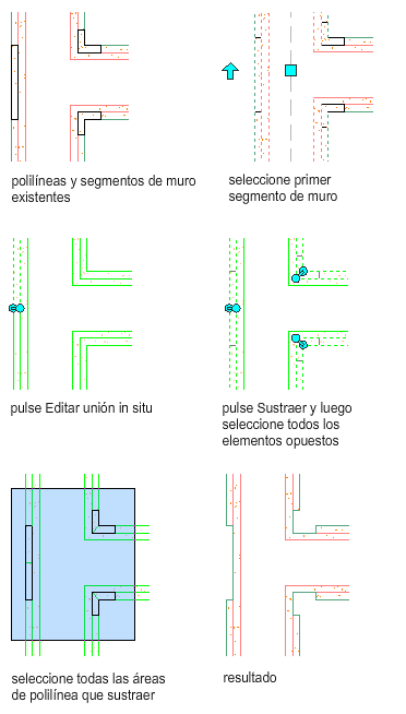 Utilice este procedimiento para modificar una intersección de muro sustrayendo un perfil de un componente. El perfil puede ser cualquier área delimitada por una polilínea que solape el componente.