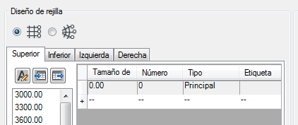Atención: En una rejilla regular que presenta el mismo diseño de línea de rejilla en ambos lados (superior/inferior, izquierdo/derecho), no es necesario definir ningún parámetro en las fichas Derecha e Inferior. Si no se especifica lo contrario, los parámetros de los lados superior e izquierdo se aplican a los lados inferior y derecho.