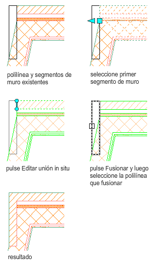 Utilice este procedimiento para modificar una intersección de muro fusionando un perfil con un componente. El perfil puede ser cualquier área delimitada por una polilínea que solape un componente o que coincida con él.